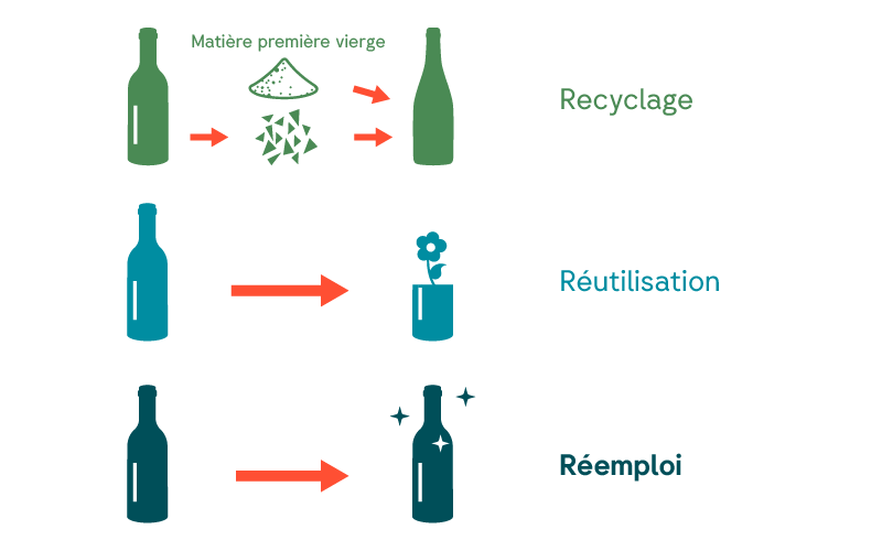 ➥ Ex : Une bouteille en verre lavée est réemployée.